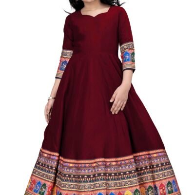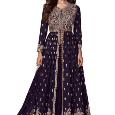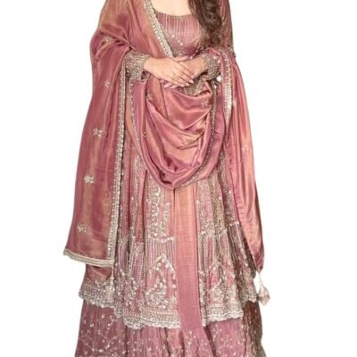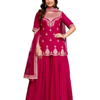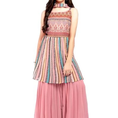 Miss Ethnik Women’s Pink Georgette Stitched kurti With Stitched Bottom and Dupatta Full Sleeve Embroidered Anarkali kurti and skirt (FL-1148-Pink-XXL)