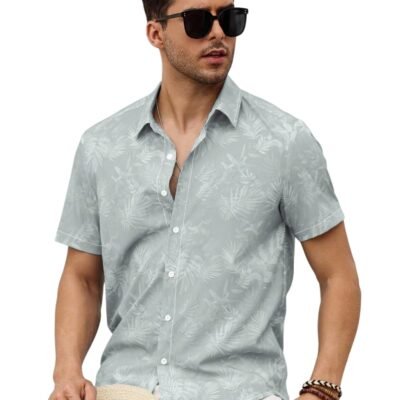 VastraVibes Men’s Tropical Printed Casual Shirt | Slim Fit Short Sleeve Summer Shirt | Lightweight Breathable Fabric | Beach & Vacation Wear (in, Alpha, L, Regular, Light Grey)