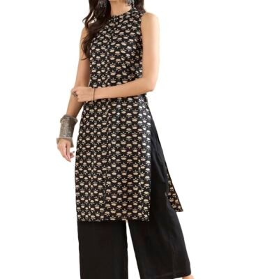 miss fame Women’s Sleeveless Printed Cotton Kurta with Palazzo – (Brown, X-Small)