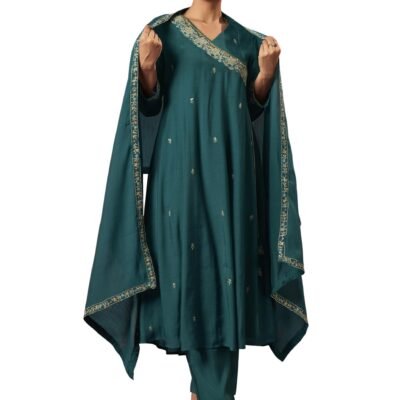Arangya Women’s Embroidery Neck Anarkali Kurta Pant Set l Designer Dupatta with Embroidered Border l Elegant Festive Ethnic Suit Teal Green