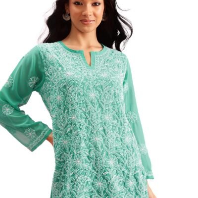 Ada Hand Embroidered Georgette Lucknow Chikankari Short Kurti Regular Fit Top For Girls & Women A911224 (Large,Sea Green)