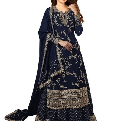 Miss Ethnik Black Faux Georgette Kurta Palazzo Set with Semi-Stitched Top, Stitched Bottom and Dupatta – Embroidered Straight Kurta Dress Material for Women’s, Blue