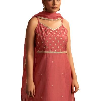 Arangya Chanderi Hand Work Elegant Sleeveless Top & Matching Wide-Leg Pants with Organza Dupatta Festive for Women Rose Pink