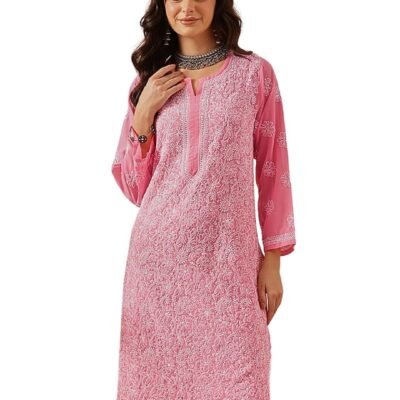 Ada Women Georgette Regular Lucknowi Hand Embroidered Chikankari Straight Kurti Kurta A95492 Onion Pink (S)