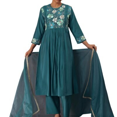 Arangya Women’s Embroidery Chanderi Flower Pattern Neck Kurta & Stright Bottom with Organza Dupatta Parfect for Festive, Everyday Ethnic Wear Blue