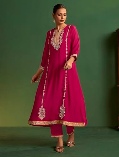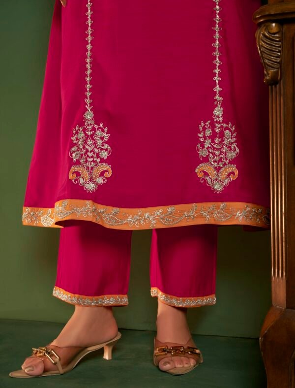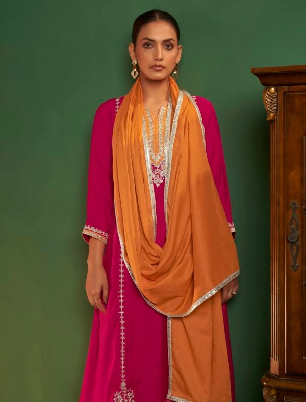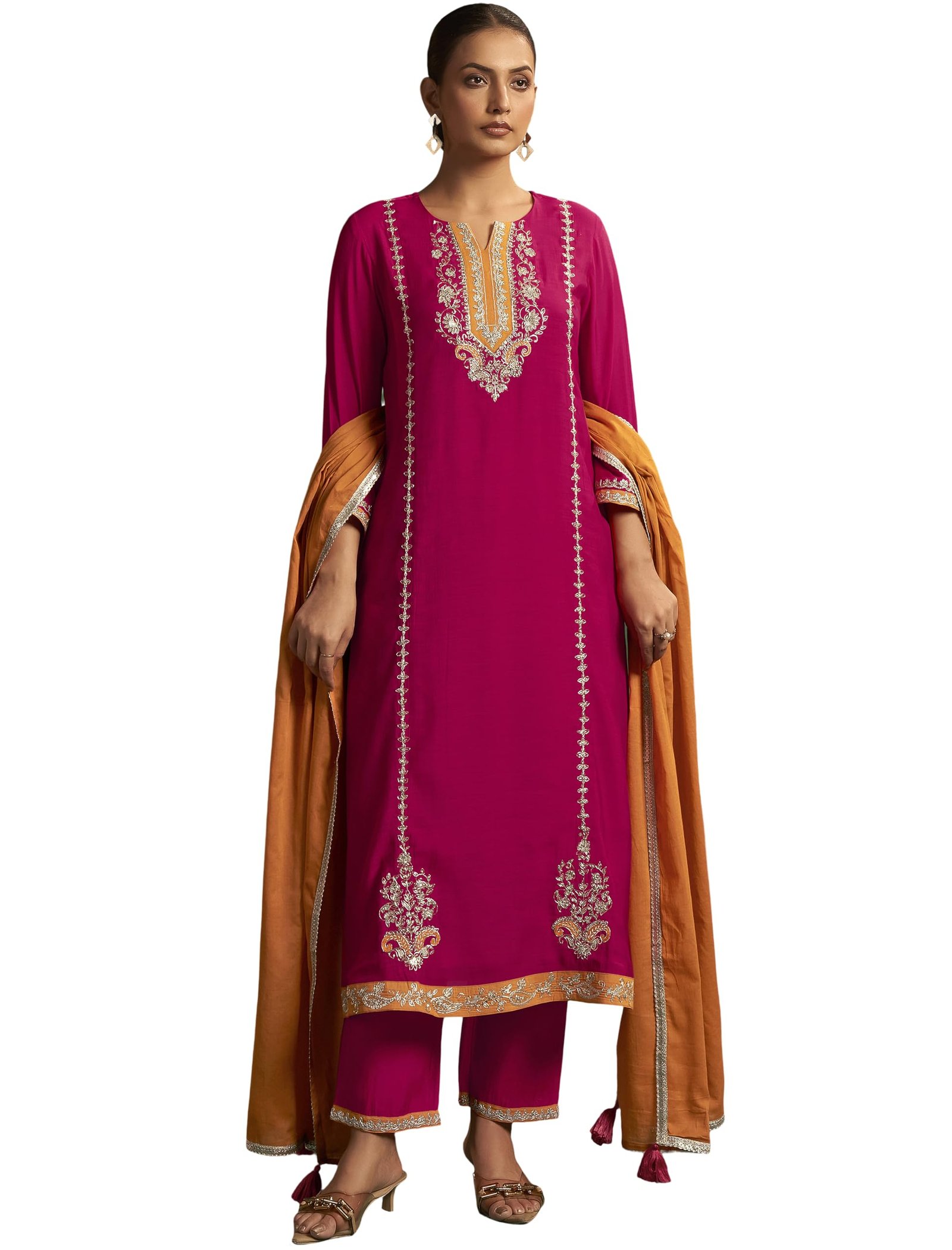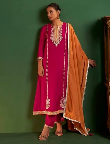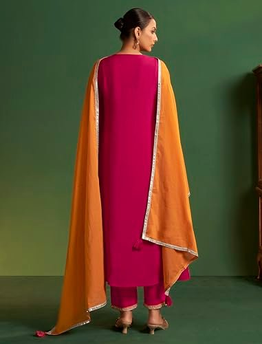 elegance with this Magenta Embroidered Kurta Set with Mustard Dupatta a perfect fusion of tradition and modernity. Crafted from Viscose Silk fabric this three-piece ensemble features a beautifully embroidered straight-cut kurta matching pants and a contrasting mustard-orange dupatta bordered with delicate silver lace. The intricate zari and thread embroidery on the neckline sleeves and hemline adds a regal charm making it ideal for festive occasions weddings or cultural gatherings.The kurta’s rich magenta color complements all skin tones while the mustard dupatta adds a vibrant pop of contrast. The soft and breathable fabric ensures comfort throughout the day allowing effortless movement without compromising style. This ethnic outfit offers a flattering silhouette suitable for all body types designed for women who appreciate timeless elegance.