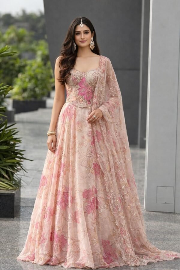 Blouse* – Pure organza corset pattern blouse with embroidery sequence work!! fully stitched size 38 padded blouse ( Margin given) lehnga* – Pure Organza digital printed lehnga. 8mtr flair lehnga with canvas patta, can can and with adjustable waist dori 🌸 Dupatta* – Digital printed organza dupatta with embroidery sequence work !! Batwa* – it includes embroidery sequence work and moti work designer batwa bag !! *fully stitched*
