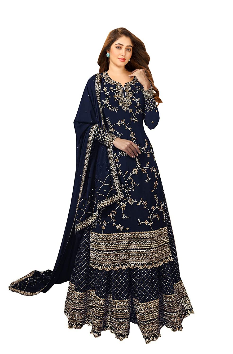 Miss Ethnik Black Faux Georgette Kurta Palazzo Set with Semi-Stitched Top, Stitched Bottom and Dupatta – Embroidered Straight Kurta Dress Material for Women’s, Blue