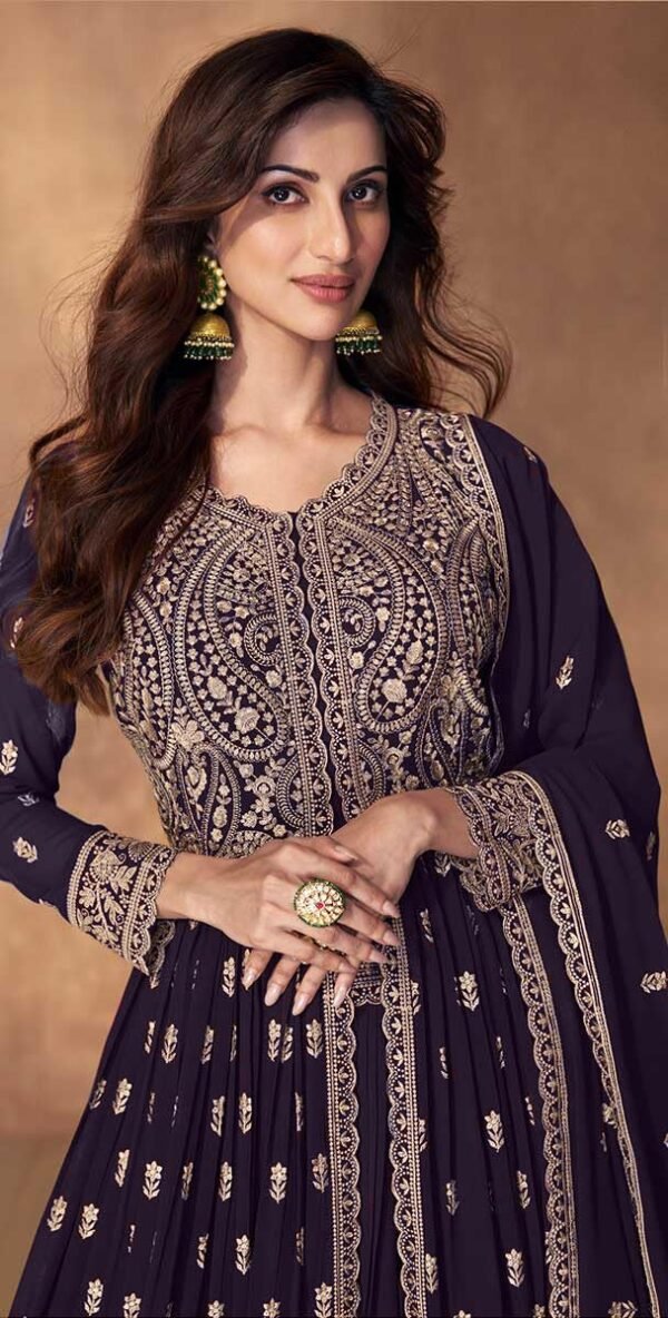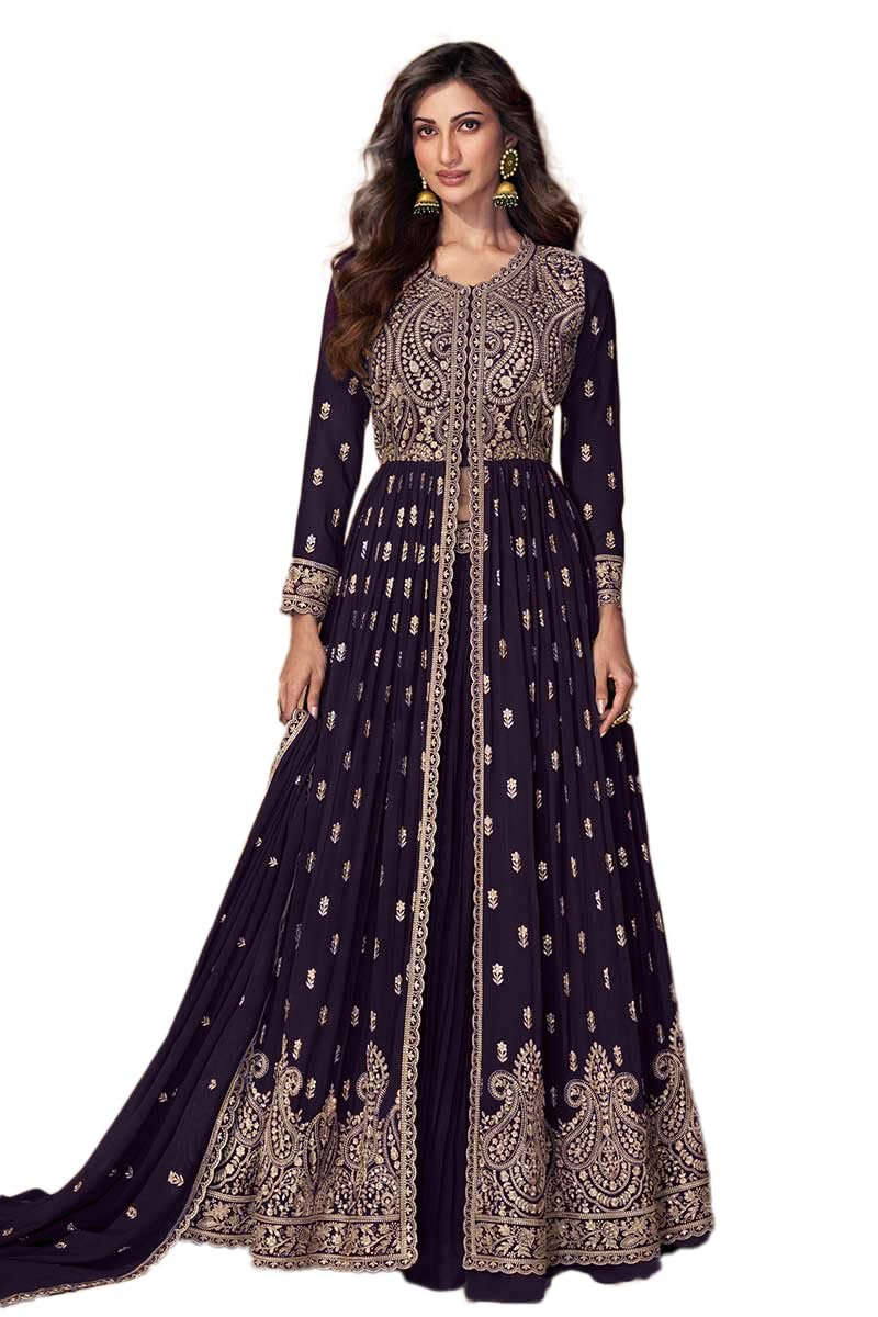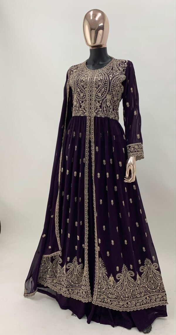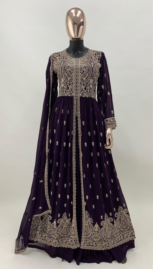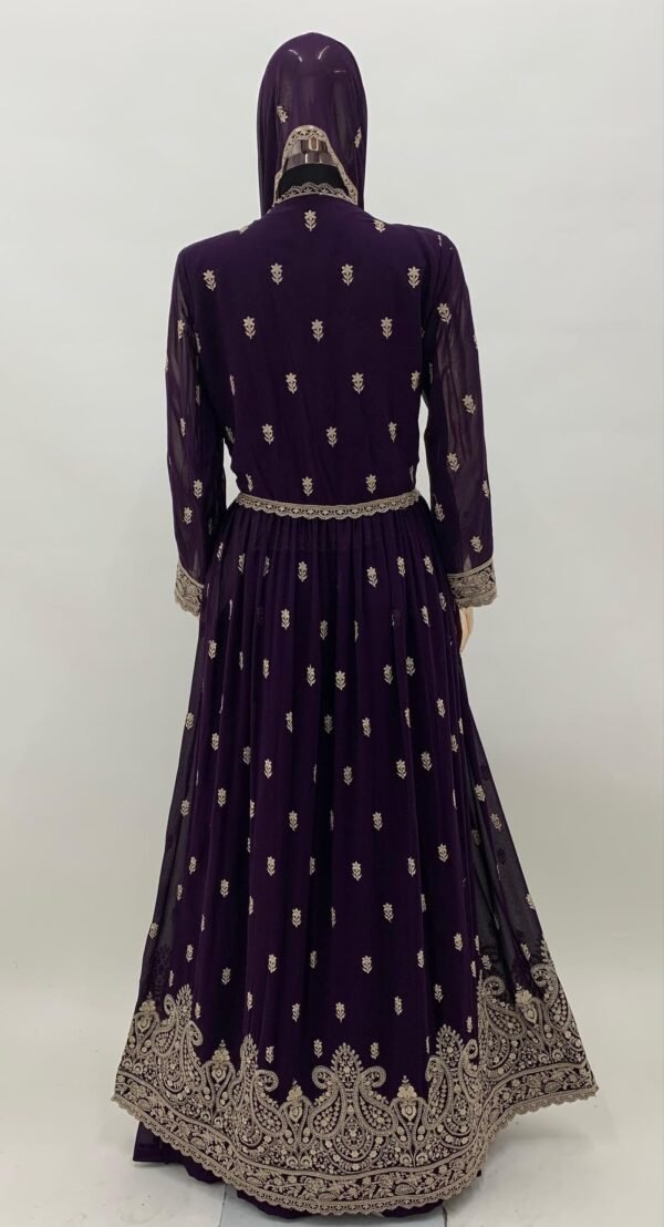 Miss Ethnik Women’s Purple Faux Georgette Stitched Top With Stitched Bottom and Dupatta Full Sleeve Embroidered Anarkali Lehenga (ME-1148-Purple-4XL)