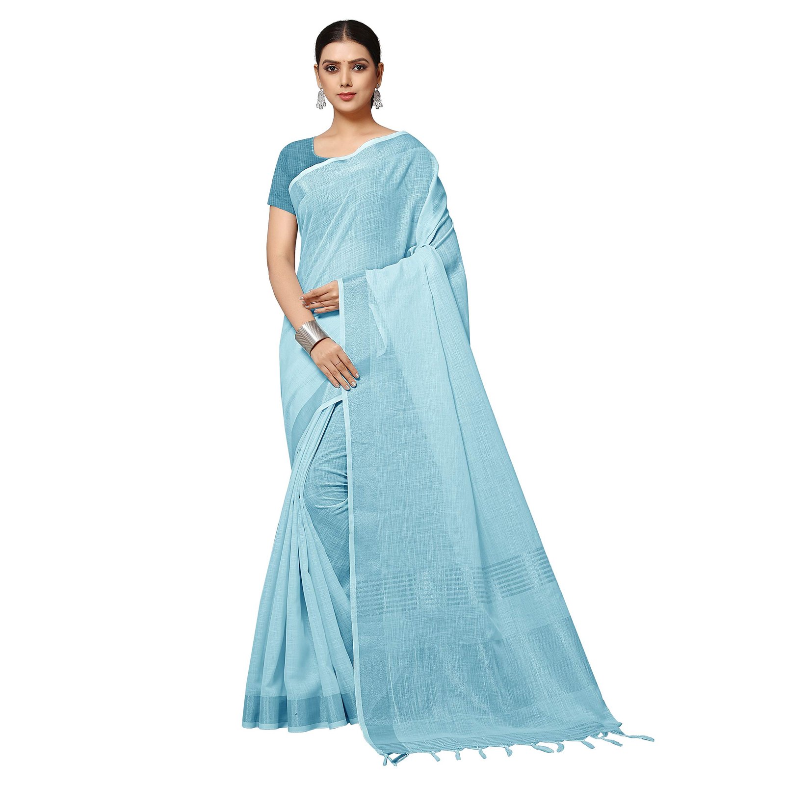 Rekha Maniyar Women’s Jacquard Linen Blue Saree with Unstitched Blouse Piece | Solid Design with Zari Border | 6.3 m Saree & 0.8 m Blouse | Evening & Ceremony