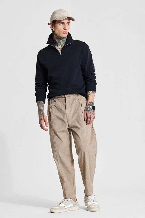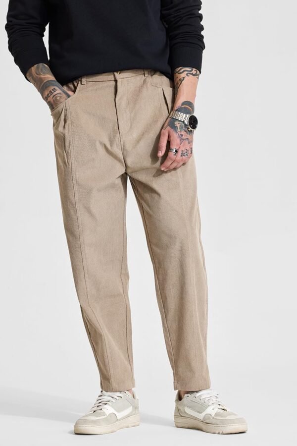 SNITCH Men Casual Trousers | Relaxed Fit, Turned-up Cuffs, Solid Pattern | 100% Polyester, Twill Weave, Pleated Front, Mid Rise, Four Pockets | Machine Washable |Beige