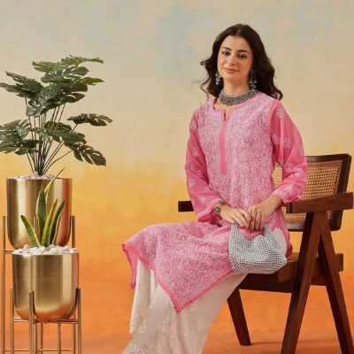Ada Women Georgette Regular Lucknowi Hand Embroidered Chikankari Straight Kurti Kurta A95492 Onion Pink (S)