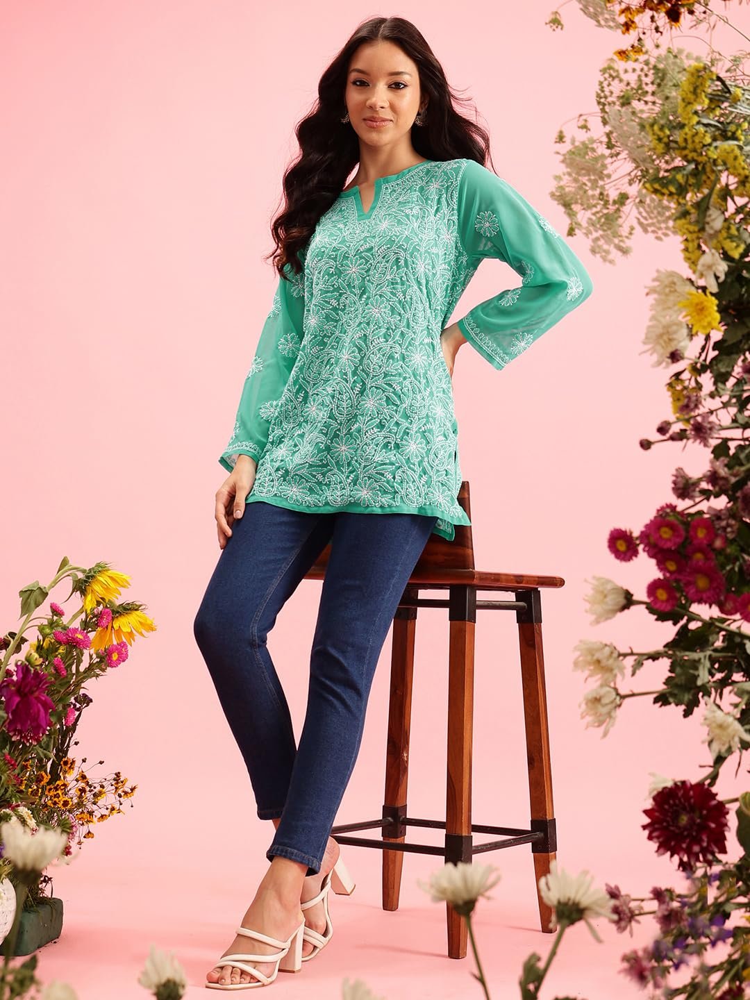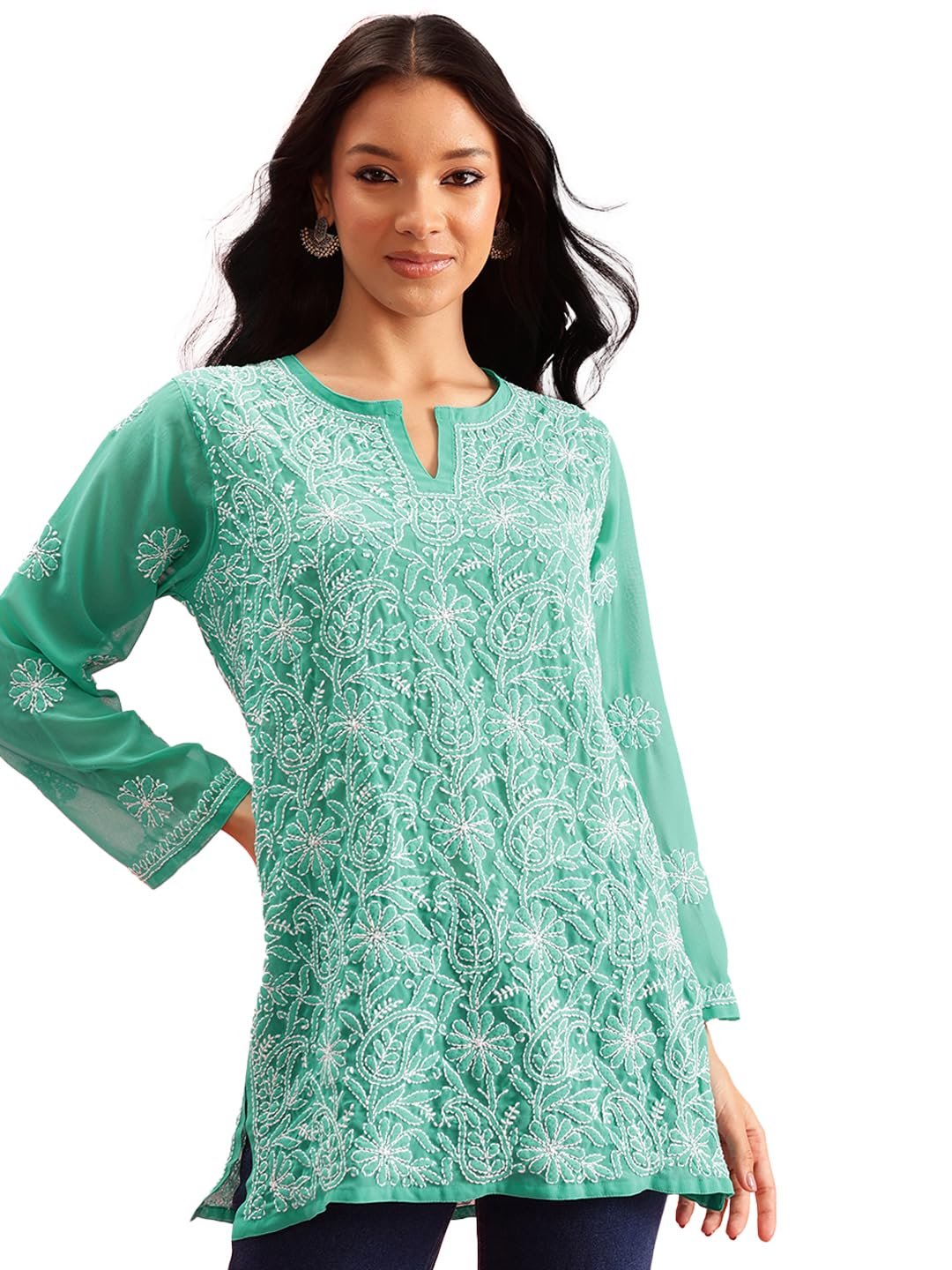 Ada Hand Embroidered Georgette Lucknow Chikankari Short Kurti Regular Fit Top For Girls & Women A911224 (Large,Sea Green)