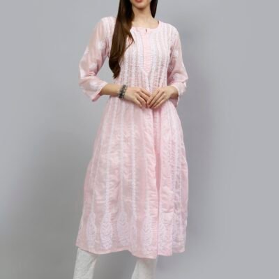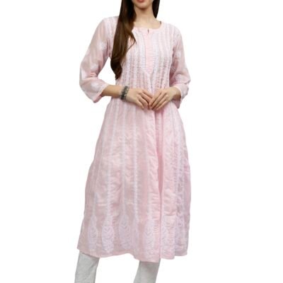 Seva Chikan Women Terivoil Cotton Regular Fit Hand Embroidered Lucknowi Chikankari Pink Flared Anarkali Kurta (4505_Pink_L)